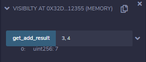 If we take a look at a screenshot of the deployed contract you will see that you only have a button to call the public function get_add_result and not the private add function. Note when submitting of 3 + 4 the get_add_result function is easily able to access the private functionality even if you cannot directly and 7 is returned.
